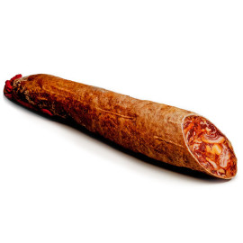Chorizo de bellota 100%  ibérico, embuchado en tripa cular y curado durante seis meses en bodegas naturales sorprende por su suave aroma e intenso sabor que te transportara a tiempos pasados.